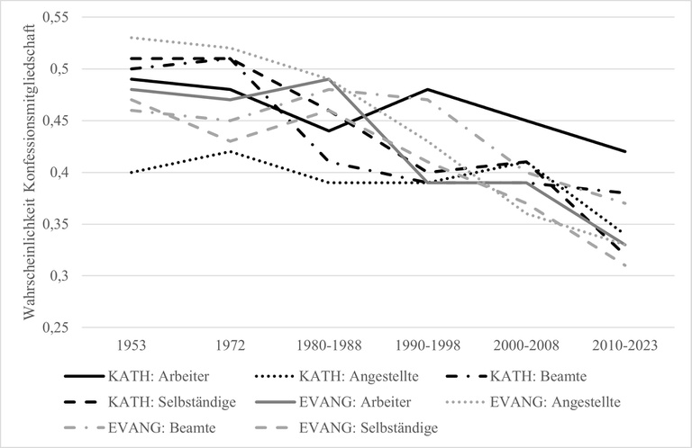 Wir haben eine weitere Studie zur sozialstrukturellen Verortung von Religiosität publiziert. Eine Trendanalyse mit ALLBUS- und weiteren Datensätzen im Zeitraum 1953–2023 zeigt, dass das Verhältnis von Arbeiterinnen und Arbeitern zu Religion und Kirche überraschend ambivalent ist. Einerseits sind (besonders katholische) Arbeiter überdurchschnittlich häufig Kirchenmitglieder (geblieben) und nehmen Passageriten wie Taufen oder kirchliche Beerdigungen relativ häufig in Anspruch – zugleich ist der regelmäßige Kirchgang eher selten. Vertiefende Analysen deuten darauf hin, dass Religiosität für Teile der Arbeiterschaft auch eine Ressource zur Bewältigung von ökonomischen Sorgen und Anomiegefühlen sein kann.