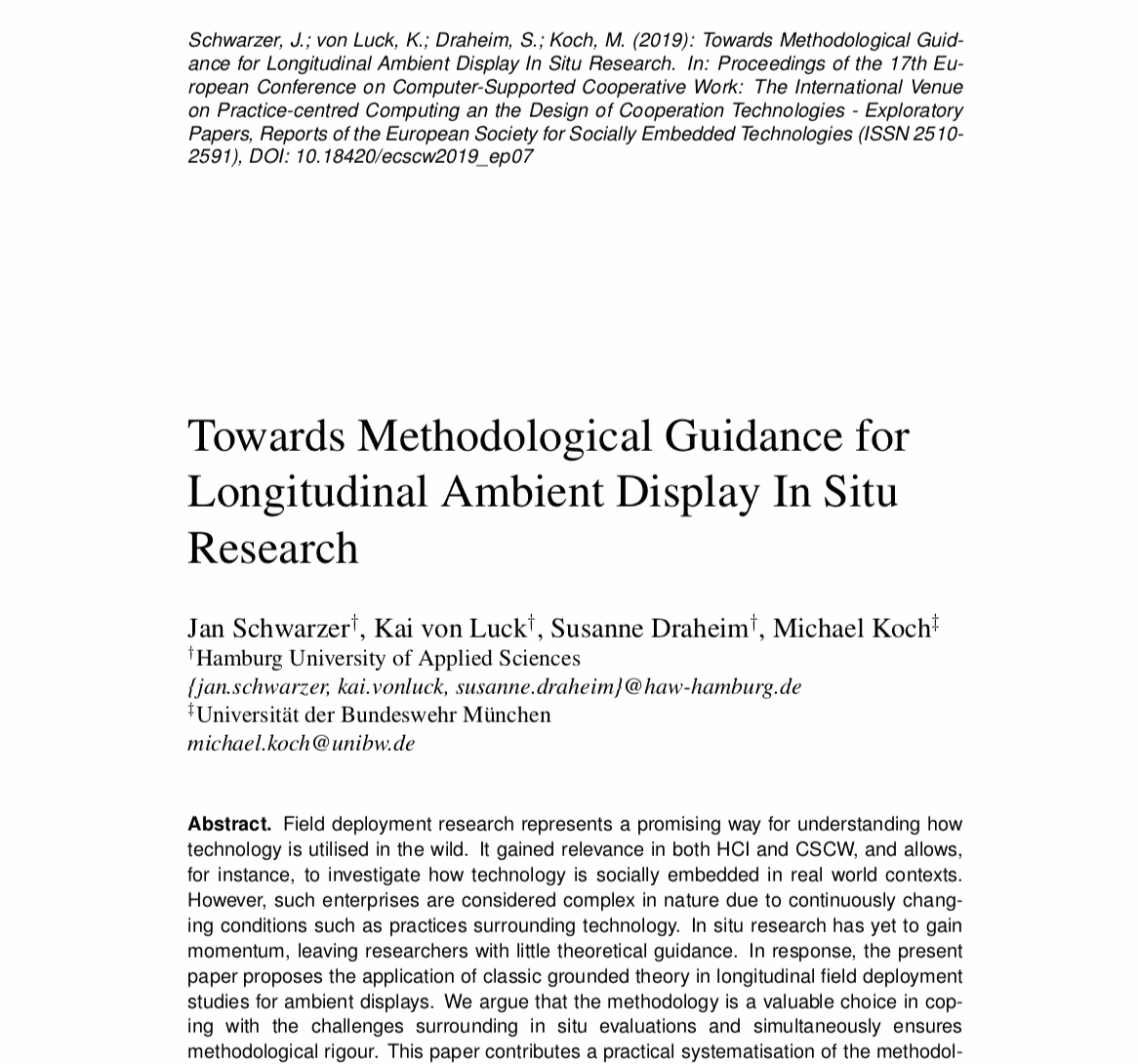 Auf der diesjährigen European Conference on Computer-Supported Cooperative Work (ECSCW 2019) in Salzburg wird das Papier "Towards Methodological Guidance for Longitudinal Ambient Display In Situ Research" vorgestellt, das wir zusammen mit Kollegen von der HAW Hamburg geschrieben haben.