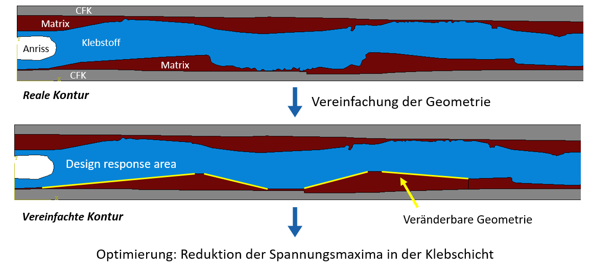 Im Rahmen einer Abschlussarbeit sollen Finite-Elemente-Modelle von Probekörpern mit verschiedenen Fügeteiltopographien erstellt werden. Anhand dieser Modelle soll durch Variation der Geometrie der Einfluss der Fügeteiltopographie auf die Spannungsverteilung in der Klebschicht analysiert werden. Optional soll eine Optimierung der Fügeteiltopographie durchgeführt werden, mit dem Ziel, die maximal auftretenden Spannungen in der Klebschicht zu reduzieren.