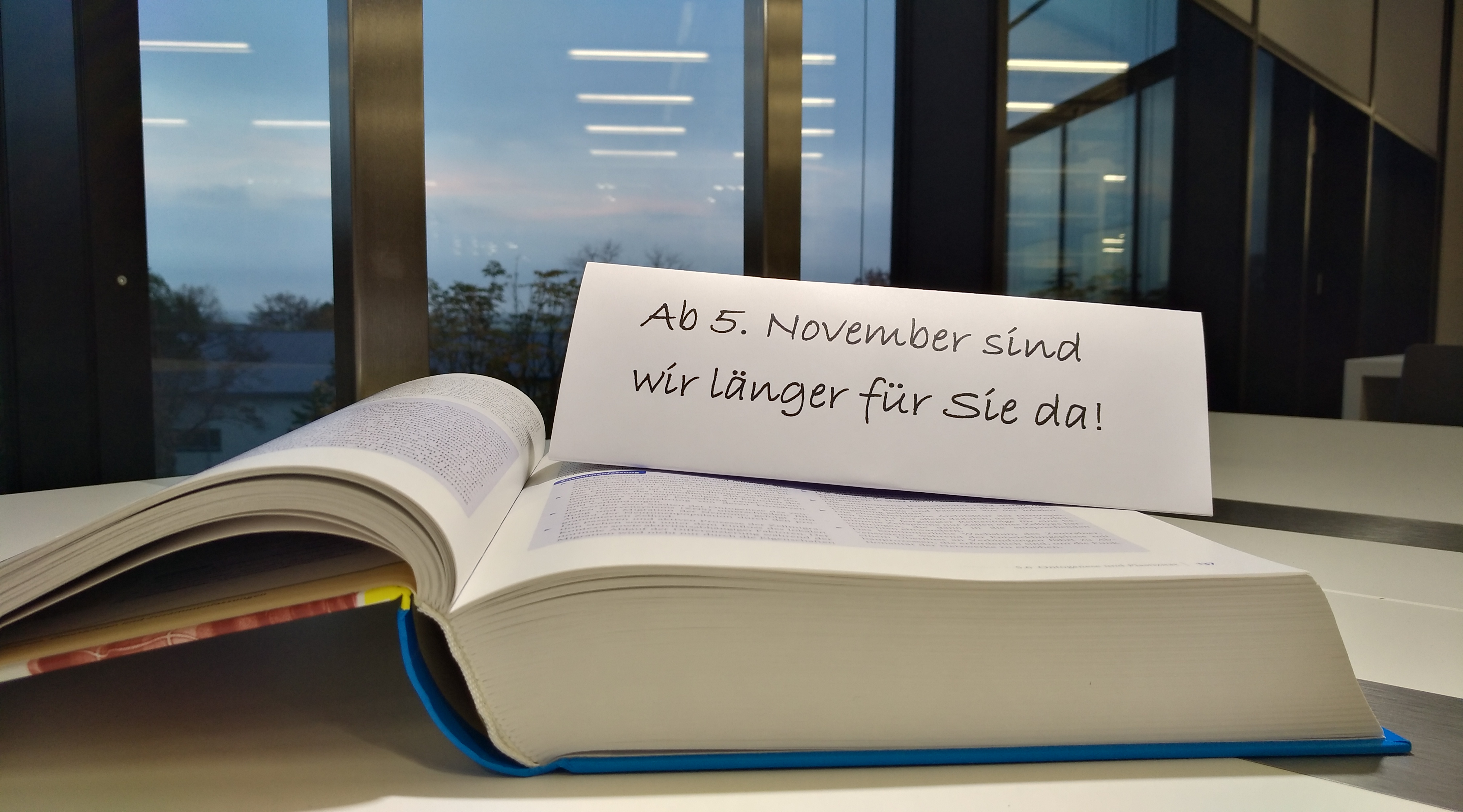 Wir haben jetzt in Gebäude 35 von Montag bis Freitag bis 20 Uhr geöffnet.