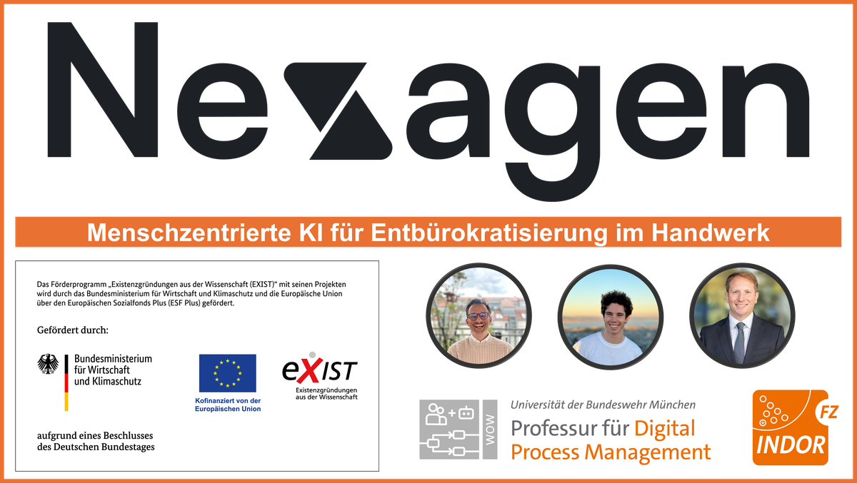 Zum 1. April 2025 ist das Projekt Nexagen gestartet. Das Projekt wird im Rahmen des EXIST-Gründerstipendiums (Gründer: Richard Sander und Ben Heckmann; Mentor: Prof. Dr. Christoph Peters) vom Bundesministerium für Wirtschaft und Energie (BMWE) sowie dem Europäischen Sozialfonds (ESF) gefördert. Nexagen fokussiert die Entwicklung einer Lösung zur Automatisierung von administrativen Prozessen in Handwerksbetrieben. Ziel ist es, dem Fachkräftemangel durch KI-gestützte Entlastung im Backoffice entgegenzuwirken.